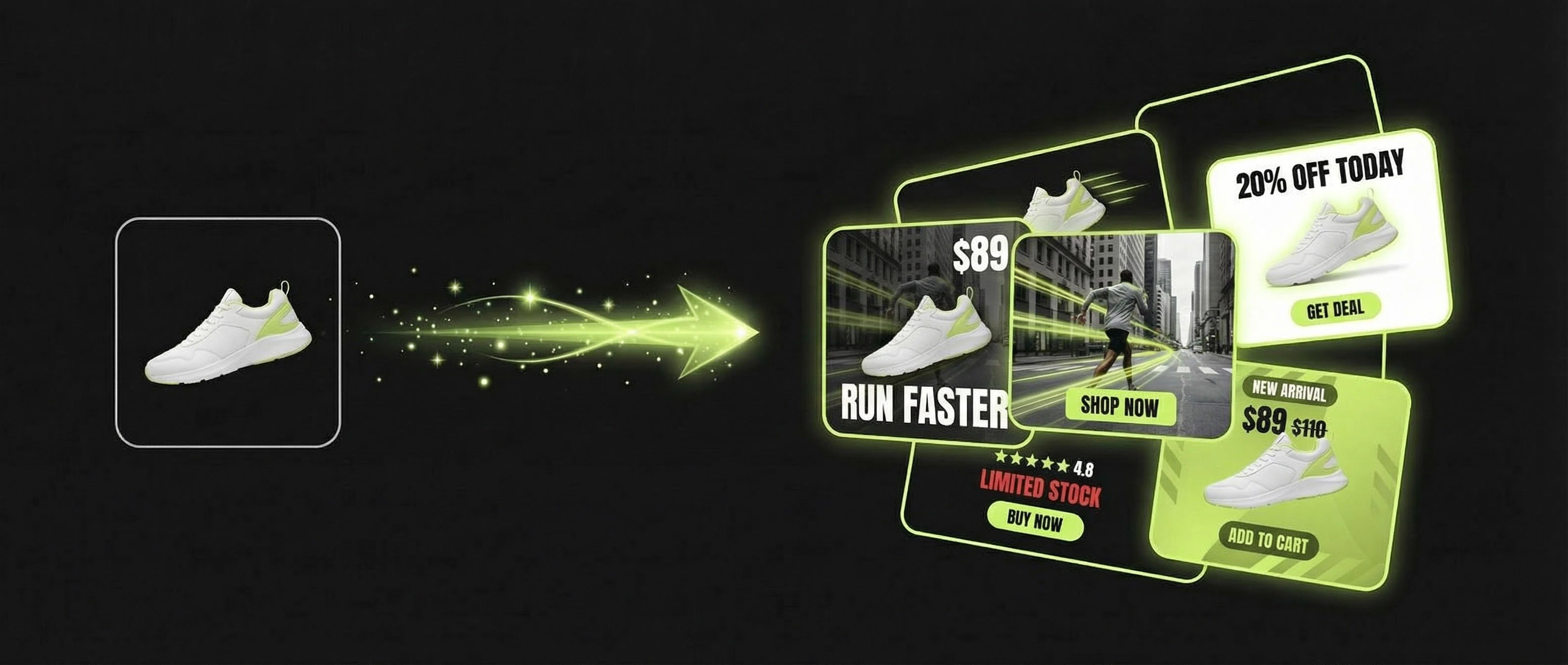 Browse 1000+ high-performing ad templates. Pick one, drop in your product, done.